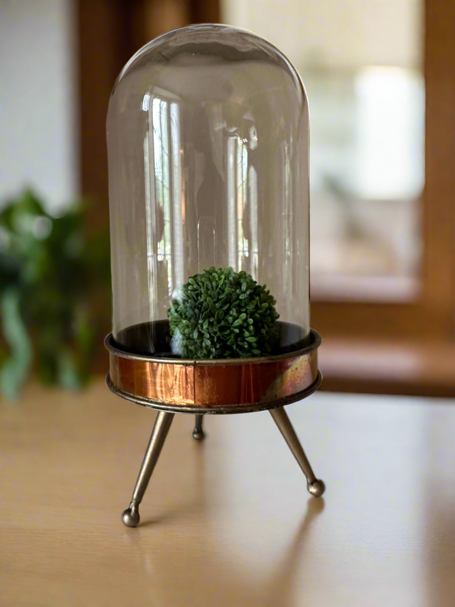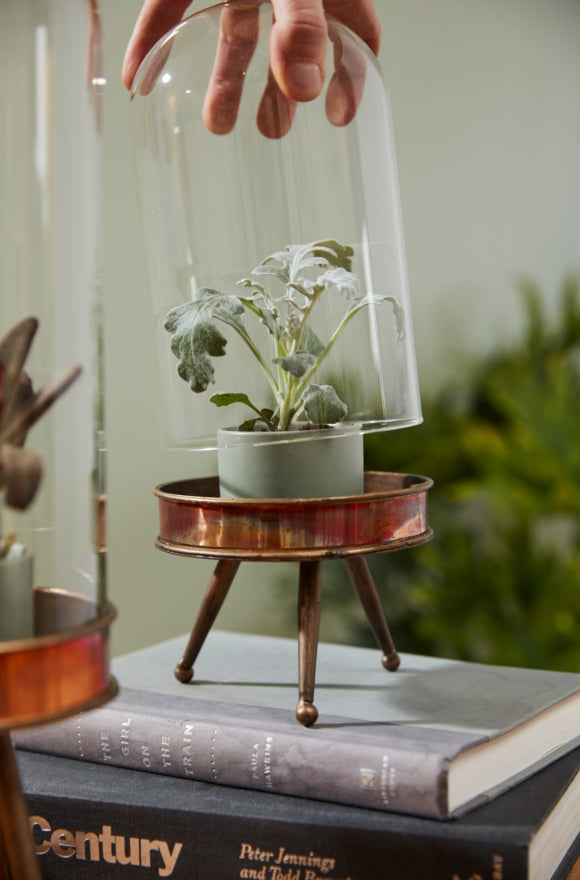 Glass and metal in a gold finish, the Historic Cloche Stand comes in two pieces. The glass dome tops the quirky modern silhouette of the metal base for a piece both practical and unique.