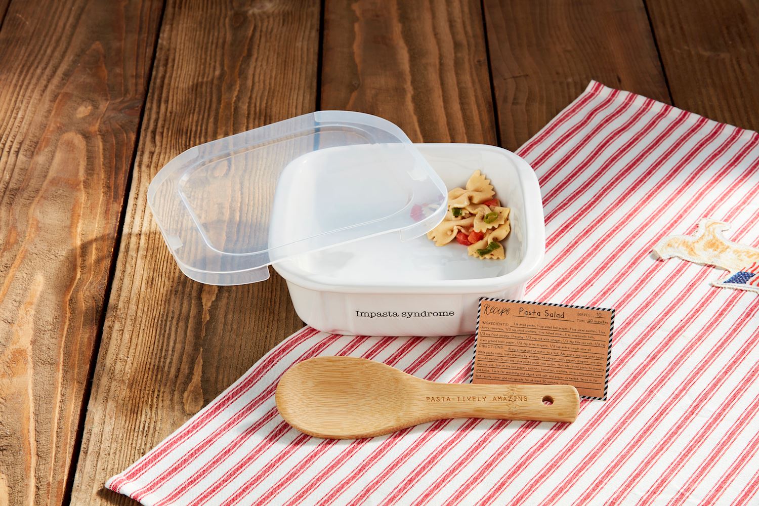 Impasta Syndrome! This whimsical 3-piece set will have your dinner guests doing a double-take. Our deli pasta container inspired ceramic dish perfectly mimics those takeout classics, but with lasting quality you'll treasure for years. Each set includes a snug-fitting plastic lid for leftover storage (or hiding evidence of your midnight snacking!), a charming wooden spoon for perfect serving, and a kraft pasta salad recipe card to kickstart your culinary adventures. Perfect for pasta parties, potluck pranks, or simply adding a dash of fun to your everyday dining. Who knew being an impasta could be so deliciously stylish?