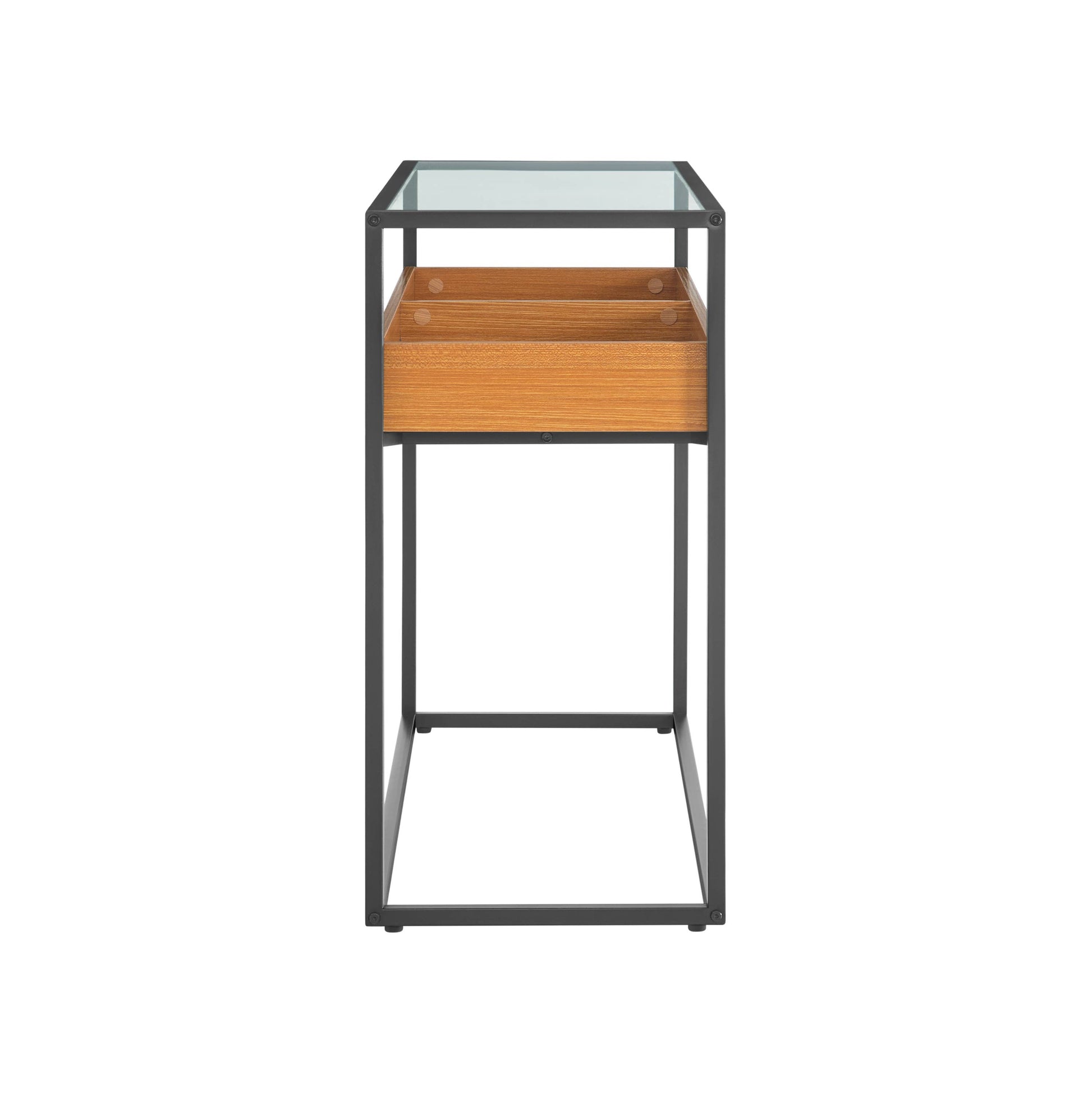 Two-Level Glass and Oak Rectangle Console Table addresses both storage and organizational needs around your home. The unique two-tier design features a clear glass tabletop and an oak laminate display shelf with compartments to showcase and store your favorite decor. Whether you arrange trailing houseplants, books, jewelry, or other decorative items in this inset shelf, your items are sure to be highlighted in style. The glass countertop is also ideal for displaying photos, sculptures, and decorative candles. The low profile of this unique console table makes it the perfect fit for smaller spaces like hallways or smaller apartments as well. The long rectangle design easily fits into diverse small spaces where you may need organization and accent decor.