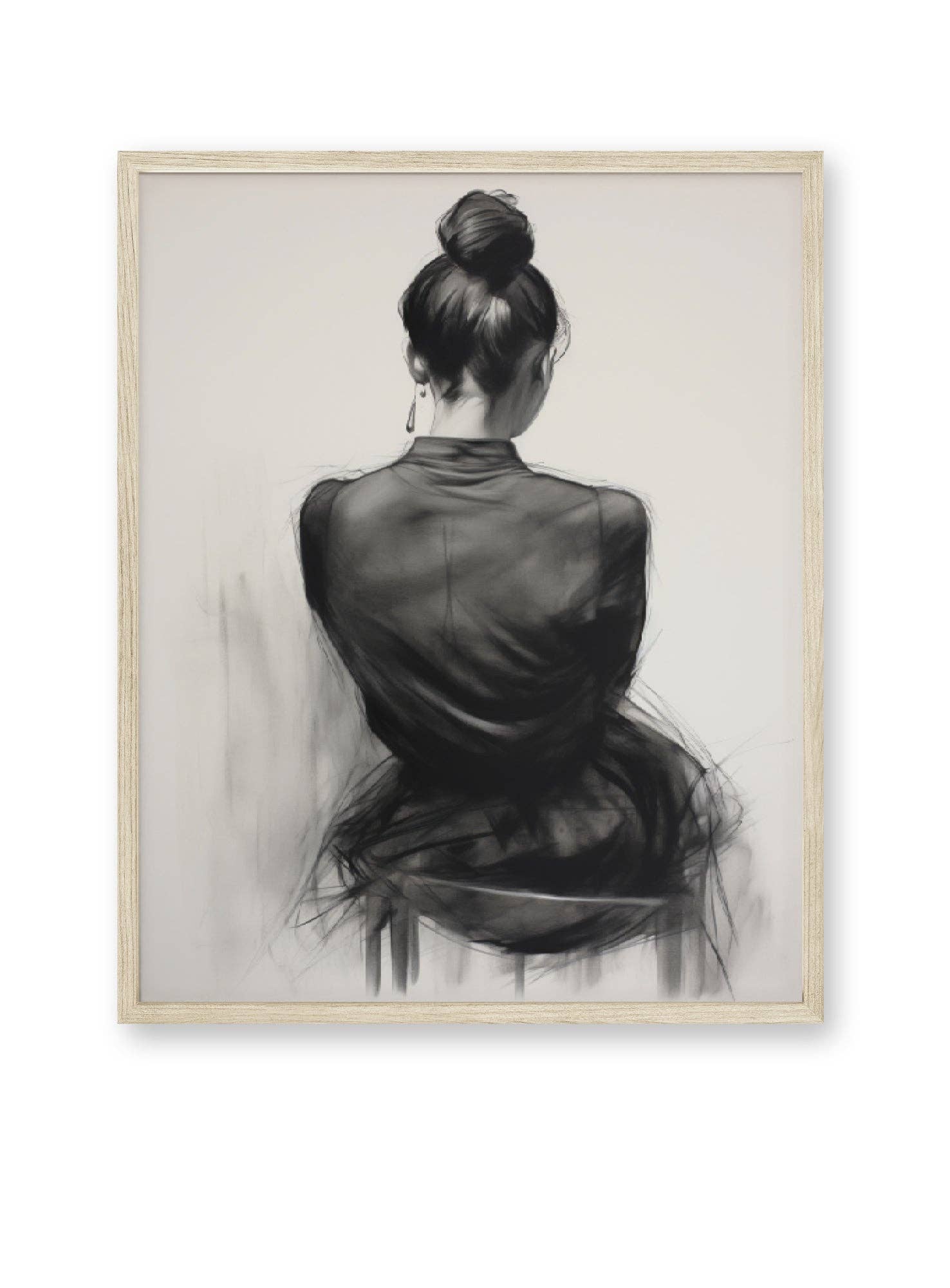 Discover the subtle beauty of "Seated Woman: Charcoal Elegance." This art print features a delicate charcoal or pencil sketch of a woman, captured from behind in a moment of introspection. With her hair effortlessly tied in a loose bun, the drawing offers a glimpse of her neck and gracefully exposed upper back. The expressive strokes and masterful shading highlight the woman's contours, while the understated background further emphasizes her form. A perfect piece for lovers of fine art, this print encapsulates emotion, form, and technique in one. Add a touch of sophistication and elegance to any space with this captivating artwork.