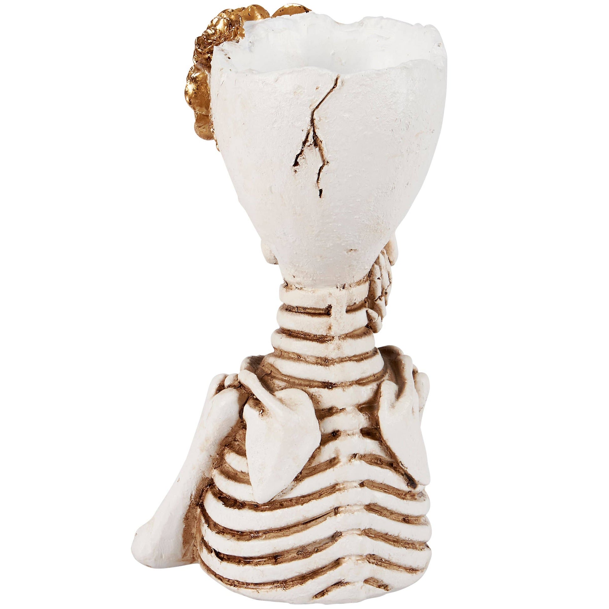 This playful Skeleton Pot Figurine features a skeleton with metallic florals and an open skull perfect for plants or decorations. With bronze accents and detailed sculpting, it adds spooky charm to your seasonal décor. Accessories sold separately.