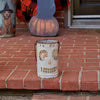 A metal lantern displaying a skull design with a spider in each eye and white paint finish with distressed details. Lantern includes space to place various light sources and features cutout details to illuminate skull design. Candle pictured not included. Our Skull lantern includes a metal handle with loop at the top to carry or hang for display. A rustic seasonal home accent with a variety of display options.