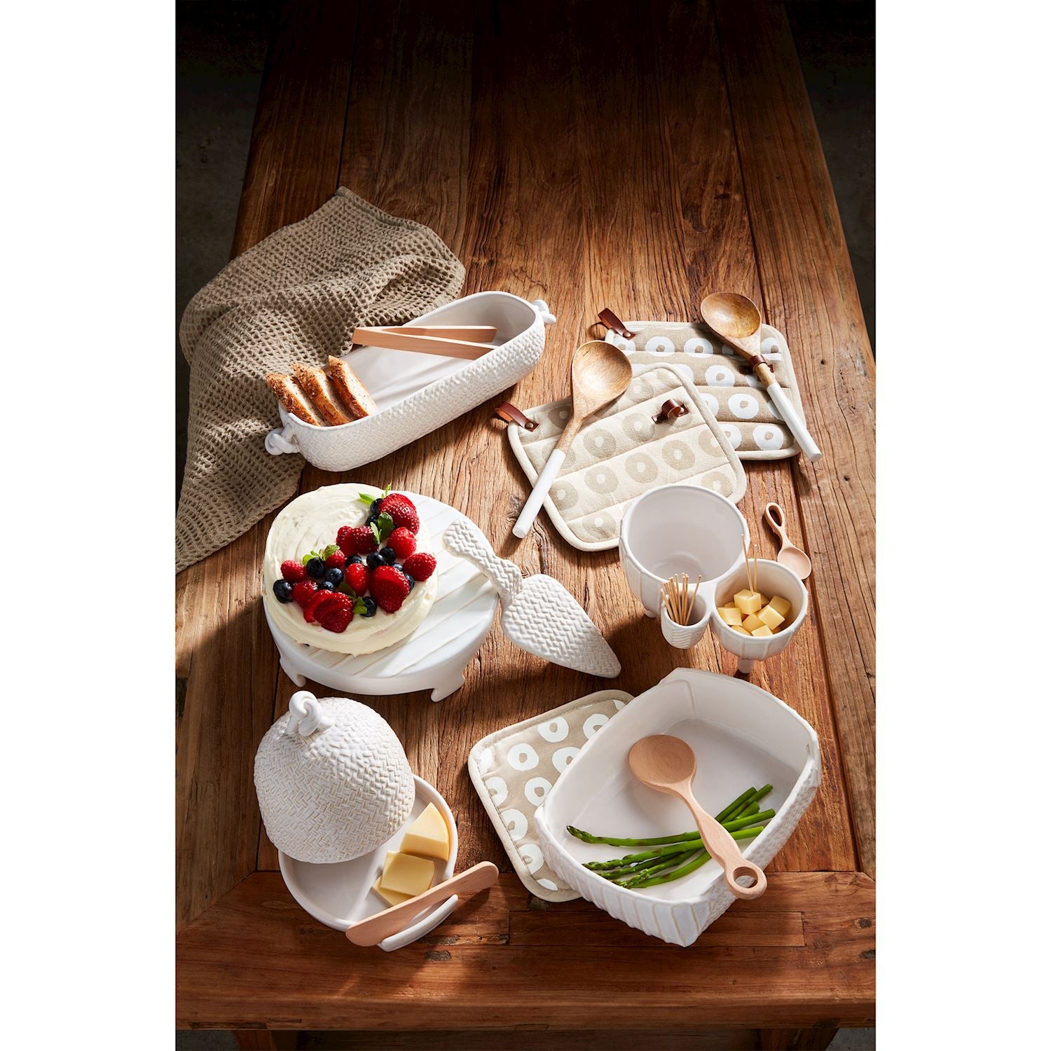 This 3-piece set features reactive glazed stoneware baking dishes with a fun textured surface. It includes a cozy cotton pot holder and a charming wooden spoon to complete your baking adventures.