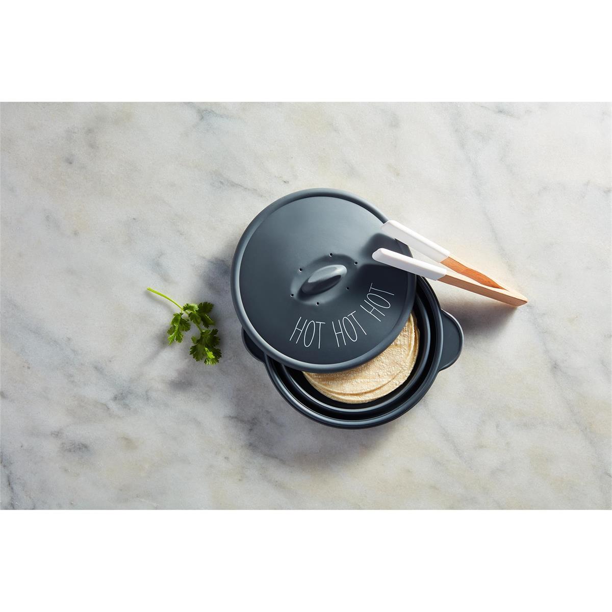 2-piece set. Silicone warming dish with lid. Comes with wood and silicone tongs.