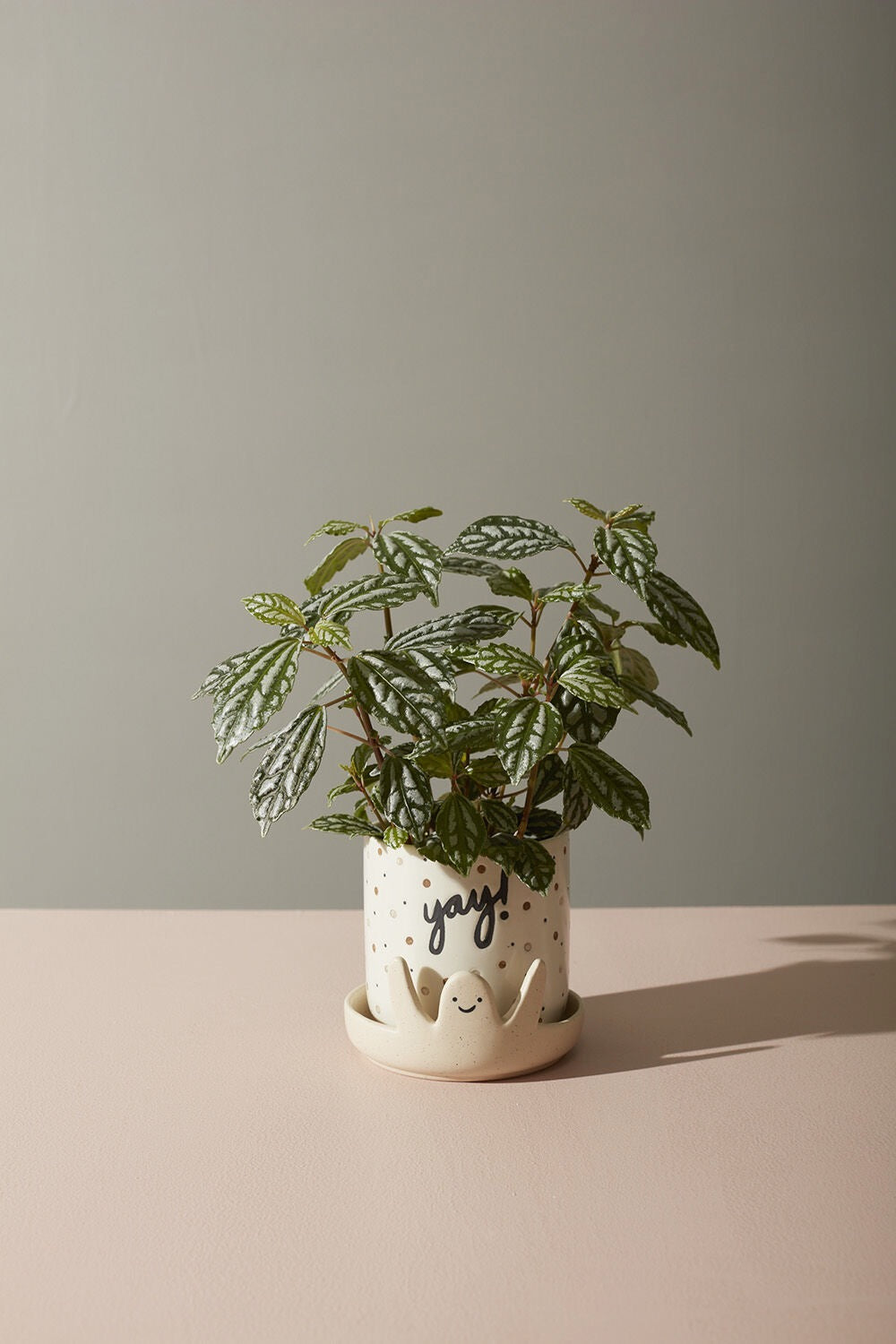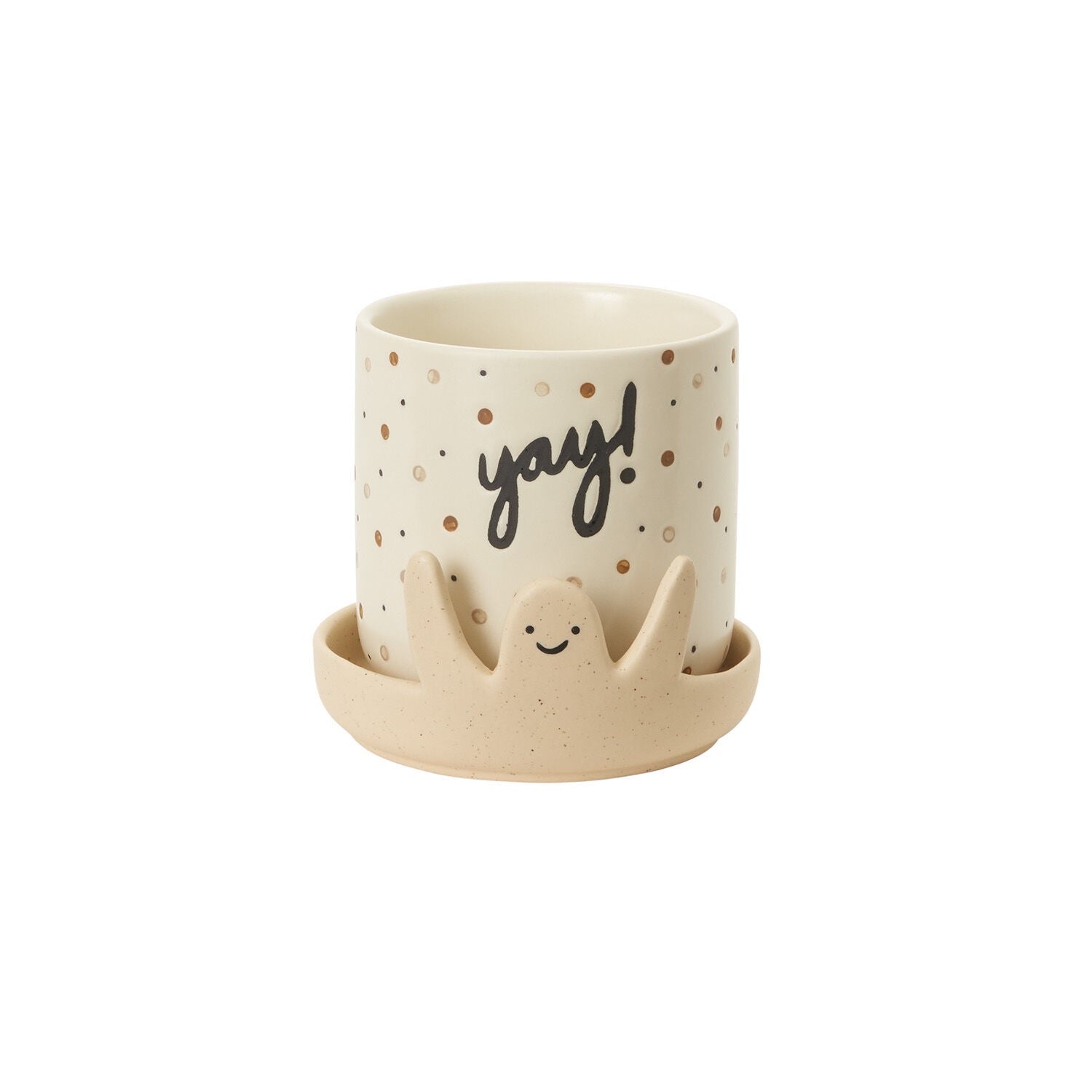 No matter your occasion, the Yay! Pot is here to celebrate with you. This whimsical piece is covered in confetti with a hand painted inscribed greeting. A smiling, excited character is shaped onto the natural bisque saucer to make the perfect gift.
